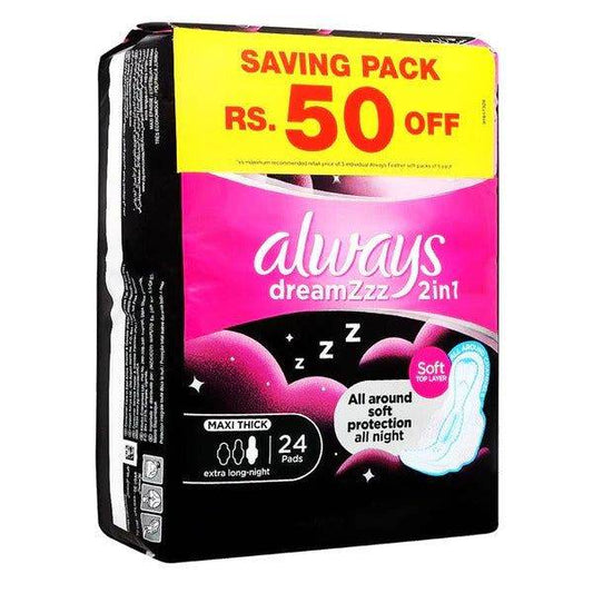 Always DreamZzz Maxi Thick Night Pads - 24ctALWAYS Dreamzzz Maxi Thick Night sanitary pads offers you true softness, down to 0% stuffiness that will last throughout the night. Try it yourself, it has changed the mind of 93% of women who tried it. This pad is longer at the back for...